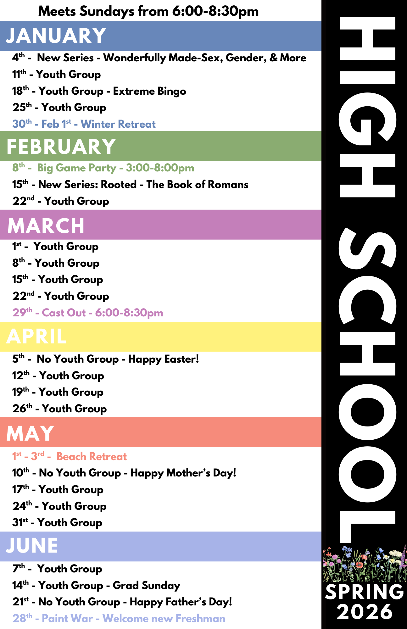 All 9th-12th graders are invited to join us every Sunday from 6-8:30 pm!
