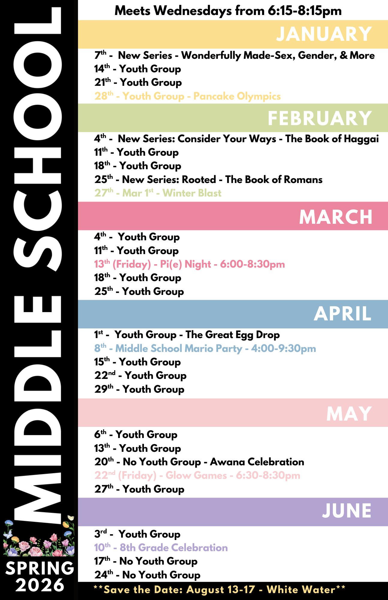 All 6th-8th graders are invited to join us weekly on Wednesdays from 6:15-8:15 pm for worship, games, a message, and small group time.